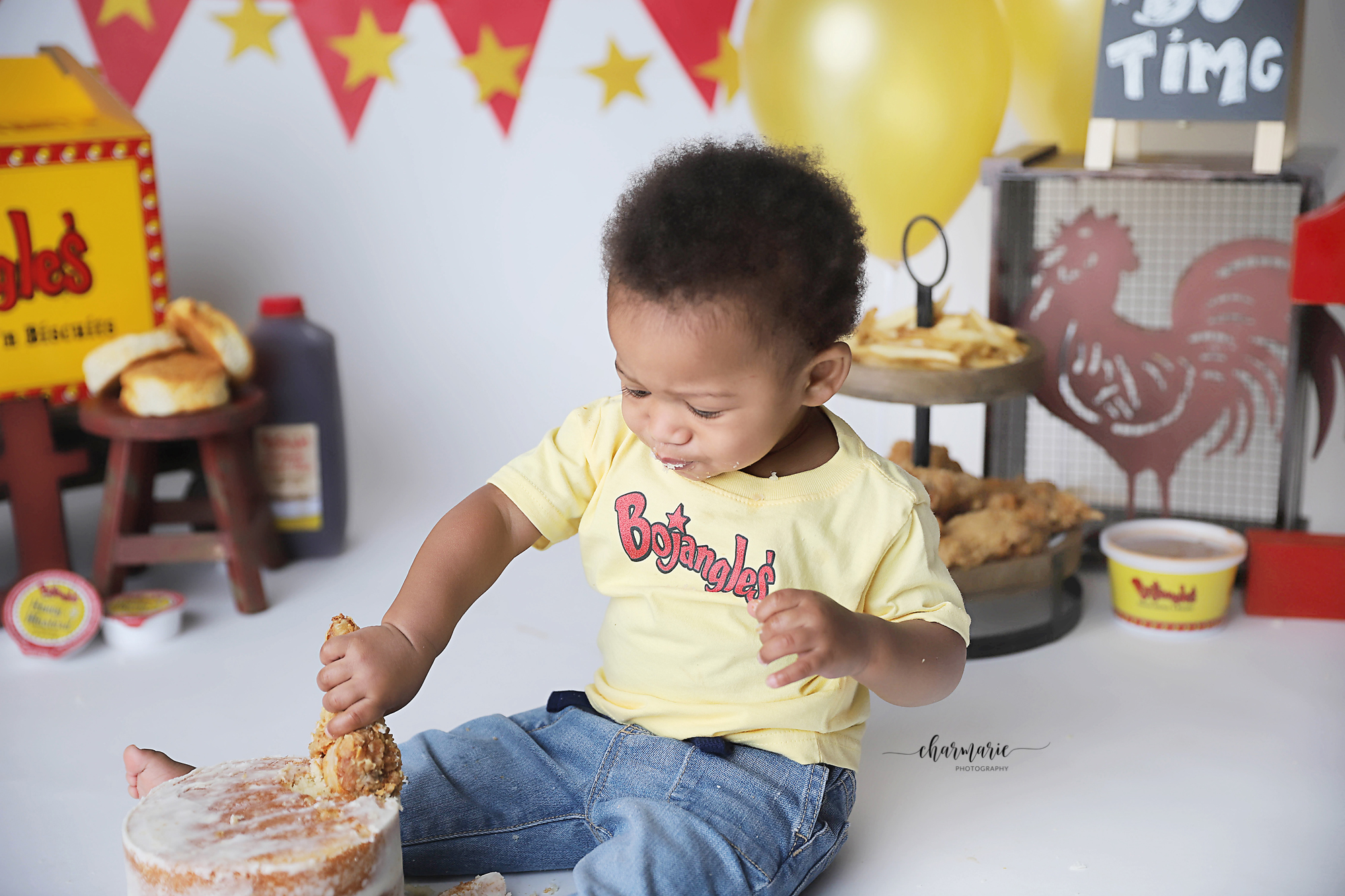 Who doesn’t love Bojangles?! Those biscuits, fries… & chicken! Chicken is definitely one of Luke’s favorite foods. Its no wonder why…. One hour after eating Bojangles Tywanda went into labor with Luke. 15 hours of labor and Luke Elliot was here on 23 October 2017. We knew we had to incorporate it in his cake smash somehow. No better way than to have a Bojangles cake smash! It’s Bo Time!! We ate good after this smash.